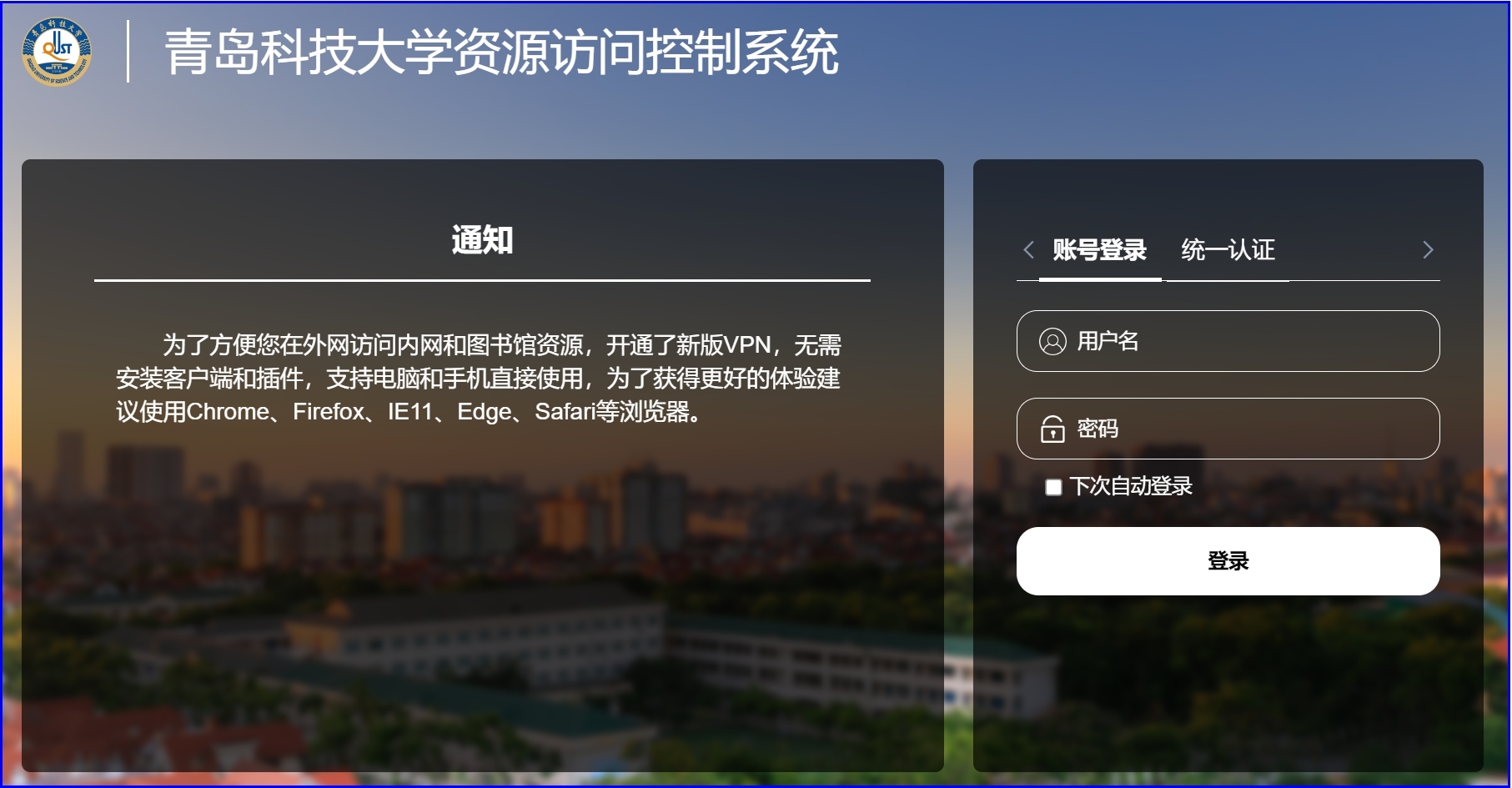 第一步VPN登录青岛科技大学资源访问控制系统,登录网址如下: